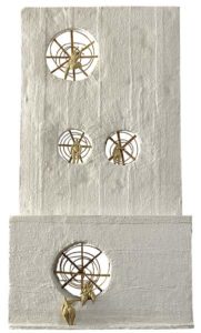 | On peut y déceler bien des féminités, de la préhistoire des vénus callipyges aux hiéroglyphes et aux codex. Ses dames-oiseaux s’inscrivent dans leur environnement géométrique comme autant de lettres sur la page, autant de notes sur la portée d’un regard de femme.Elles sont prisonnières et gardiennes de leur monde, cachées, enfermées derrière leurs fenêtres. Elles sont offertes, alanguies, en attente ou à l’abandon ; elles dansent, bougent, volent dans leurs cadres prison, univers. Elles sont fragiles et friables dans leur matière et dans leurs membres effilés, et pourtant elles sont solides et immuables dans l’arrogance de leur ventre. Les matières qui les façonnent sont à leur image, solides et fragiles, tendres et parfois vénéneuses… Micheline Doke a travaillé la terre, le plomb, la fonte, le ciment alvéolé, le bronze, la cire, la pierre de talc, la pâte à papier ou à pierre, le papier, le bois, l’aluminium, les boites de fromage, de biscuits, de conserve, les rouleaux de papier, des rouleaux de tissus ou de moquette, le rotin, le papier de soie, des papiers artisanaux d’origines diverses (Malaisie, Italie, Inde, etc.), tous les cartons possibles et imaginables, les feuilles d’or ou d’argent, le papier monnaie des cérémonies bouddhistes. Elle a mis en scène toutes ses matières, toutes ses créations de mille manières différentes, envolée de papillons, dôme géodésique, bulle de plexiglas, attente calme et posée, bijoux, boites, livres objets, œuvres de voyage ou gardienne grandeur nature. |