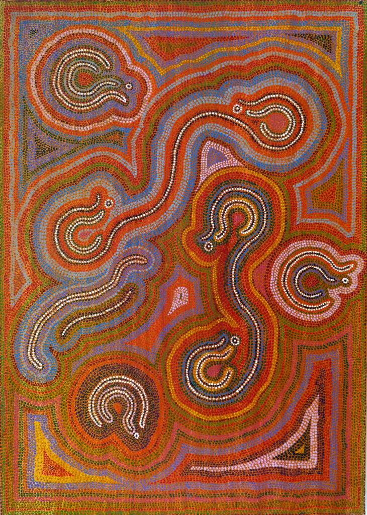 Son art est spontané et subtil. Si la ressemblance à l’art aborigène est fortuite au départ, elle n’est certes pas anodine dans le fond. Sa démarche personnelle révèle une recherche des origines, d’une fluidité et d’un apaisement pulsionnel par le domptage des points, des traits et des couleurs. La quête du mythe fondateur, de l’identité et d’une place pour ce qu’on est, et non ce qu’on devrait être dans le monde actuel ».