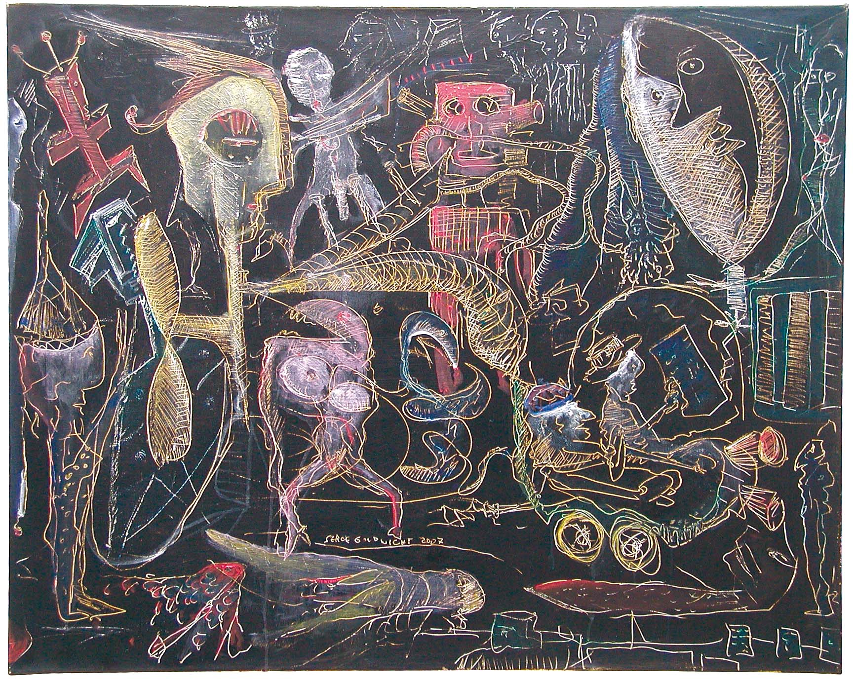 Sous la peinture se trouvent les canalisations secrètes de l’écriture première. C’est celle que veut retrouver Serge Goldwicht. Poursuivant sa démarche autopictographique, concept qu’il mit à jour lors de son exposition chez Pascal Polar en 2005 (Reportage autopictographique), les toiles et panneaux qu’il nous propose sont récents (2007) et constituent une étape radicale dans le travail de l’artiste. Grands aplats de toile noire rayée formant des dessins rapides, directs, à fleur de la surface de la toile. Machines, monstres et personnages se débattant dans un univers d’hier ou d’aujourd’hui. Une atmosphère comme un dessin animé de l’inconscient.